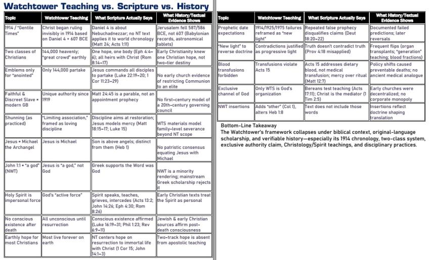 'Can you provide me a succinct bullet list of all the teachings of the Watchtower Society which fail Biblical scrutiny and/or hi... more“High-control religions don’t succeed by telling obvious lies. They succeed by anchoring people with partial truths and then redefining loyalty to the organization as loyalty to truth itself.”